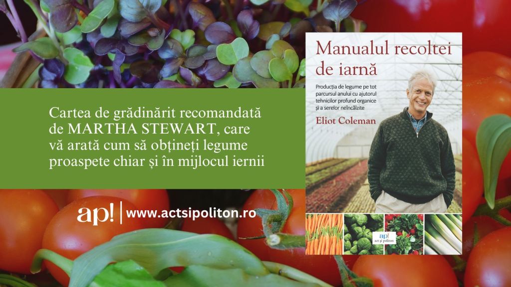 Ați visat vreodată să culegeți legume proaspete chiar și în toiul iernii? Eliot Coleman, unul dintre cei mai respectați pionieri ai agriculturii organice, vă arată cum este posibil acest lucru în cartea sa, Manualul recoltei de iarnă: Producția de legume pe tot parcursul anului cu ajutorul tehnicilor profund organice și a serelor neîncălzite, recent apărută la Editura ap!. Folosind metode sustenabile, sere reci și tehnici inovatoare, Coleman demonstrează că temperaturile scăzute nu trebuie să fie un obstacol pentru fermieri și grădinari. Această lucrare esențială oferă o sursă de inspirație și un ghid practic pentru toți cei pasionați de cultivarea legumelor pe tot parcursul anului. Cartea vorbește despre culturile, uneltele, calendarele de plantare și tehnicile pe care autorul le folosește pentru a gestiona activitatea agricolă pe durata a patru sezoane.
