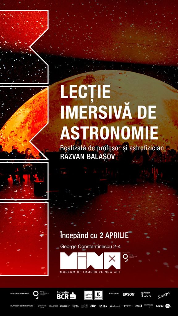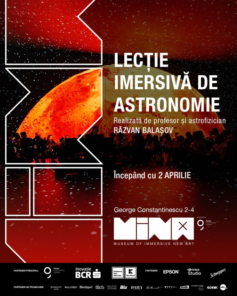 MINA, Museum of Immersive New Art, invită publicul să pornească într-o călătorie fascinantă prin Univers. Începând cu 2 aprilie, după fiecare dintre show-urile imersive „Dinozaurii: O călătorie imersivă în lumea preistorică” și „Pădurea magică”, vizitatorii vor avea ocazia să participe la o lecție de astronomie într-un format complet nou: vizual, auditiv și accesibil tuturor.
