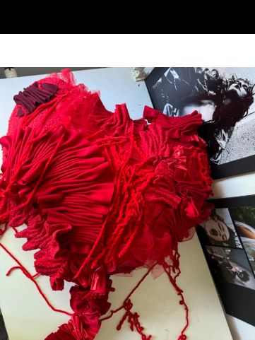 Lucrare de artă textilă, realizată din resturi de materiale textile, în ideea sustenabilității, expusă la UNA Galeria, în cadrul expoziției Școlii Doctorale a Universității Naționale de Arte București 11.12.2024 – 12.01. 2025