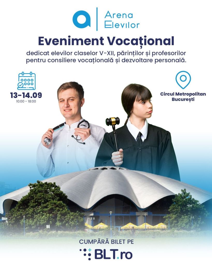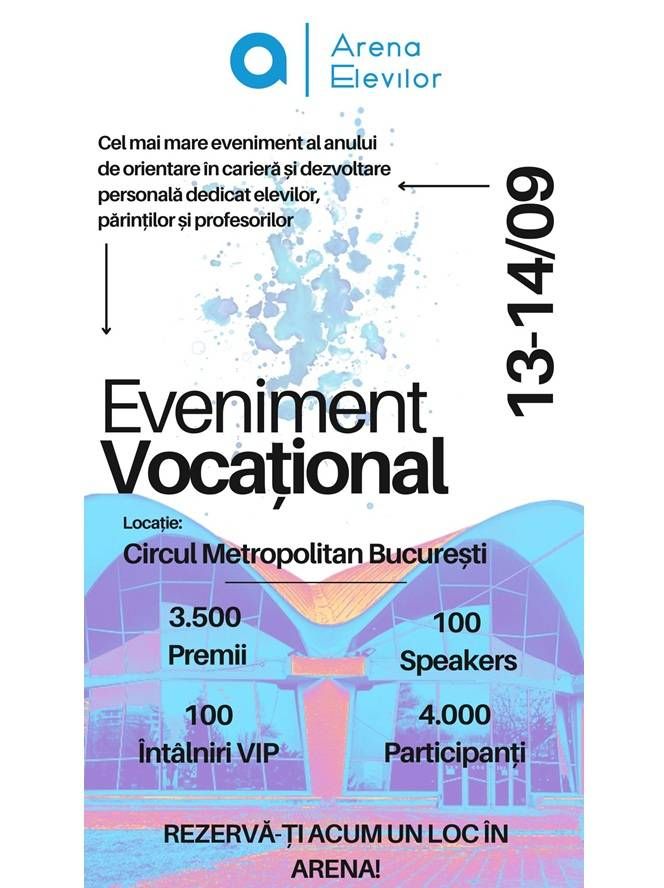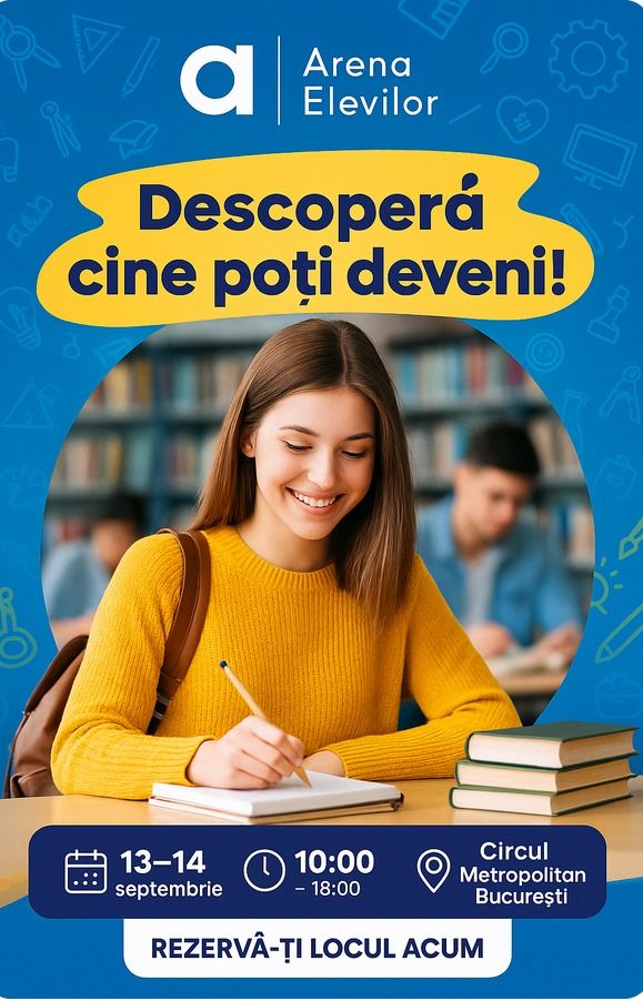 Cel mai mare eveniment de orientare în carieră din Europa este Arena Elevilor — o platformă unică pentru elevi, părinți și profesori interesați de descoperirea vocației, luarea deciziilor profesionale și dezvoltarea personală.